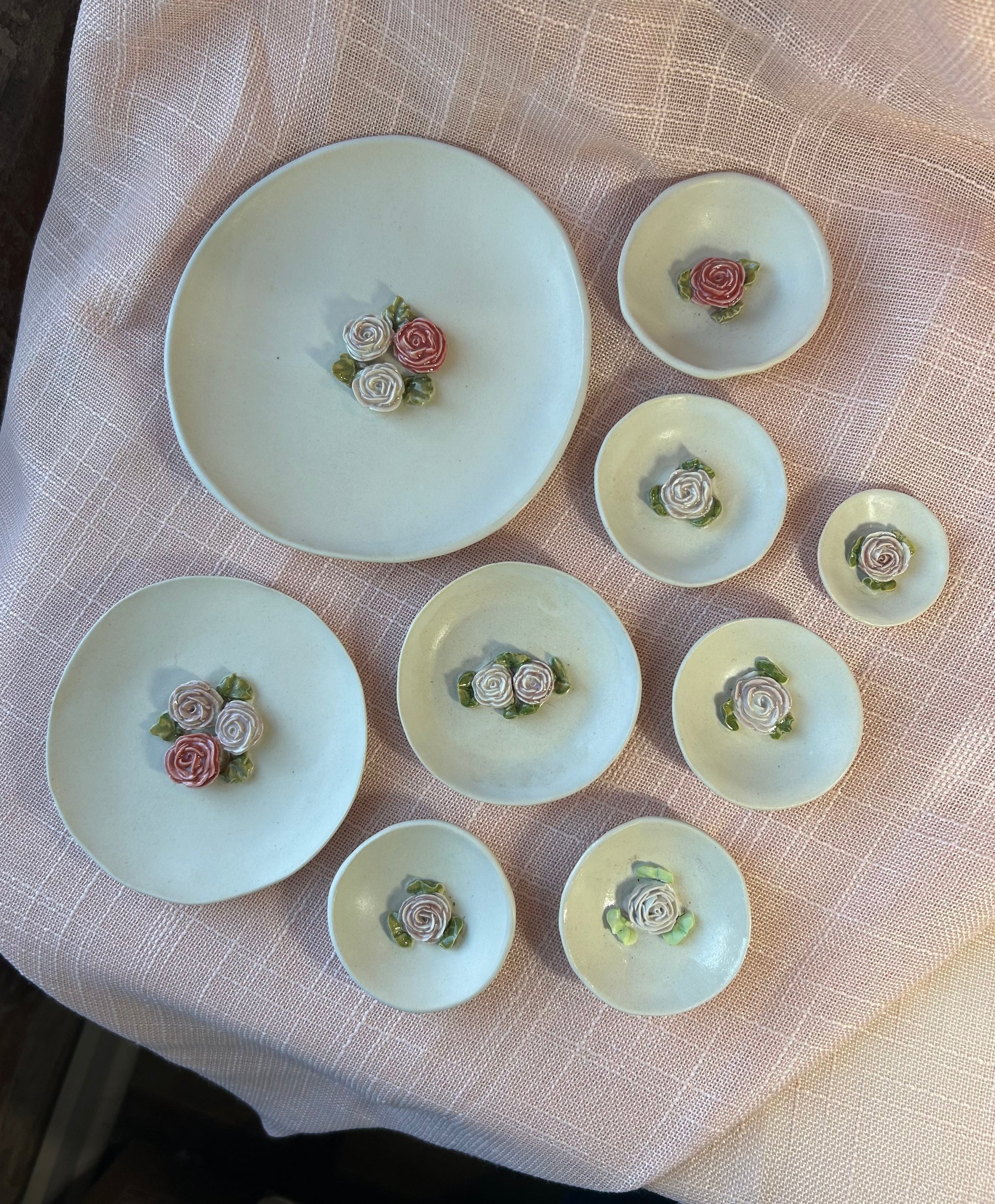 Handmade one-of-a-kind round ceramic dish, perfect for trinkets, jewelry, or snacks. Decorated with three roses in shades of pink.